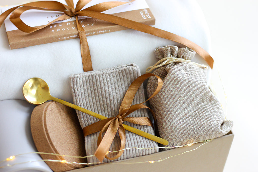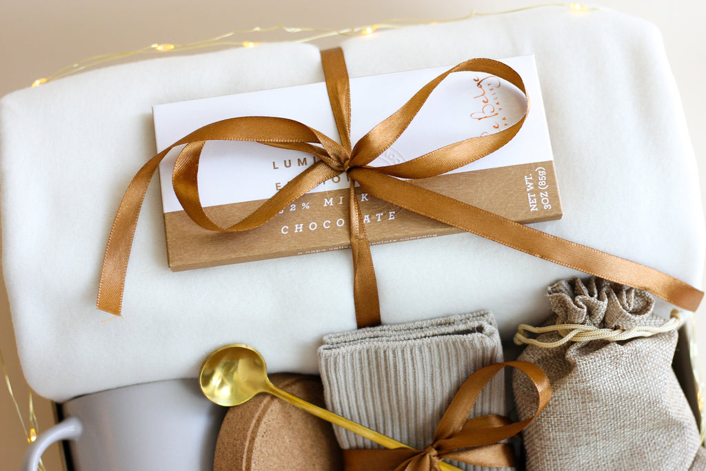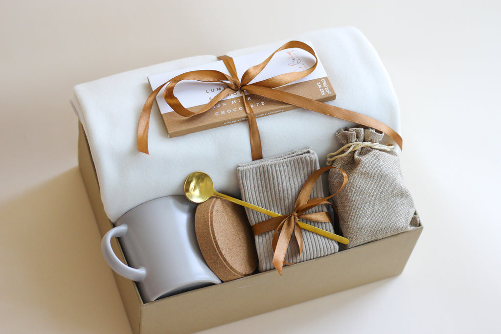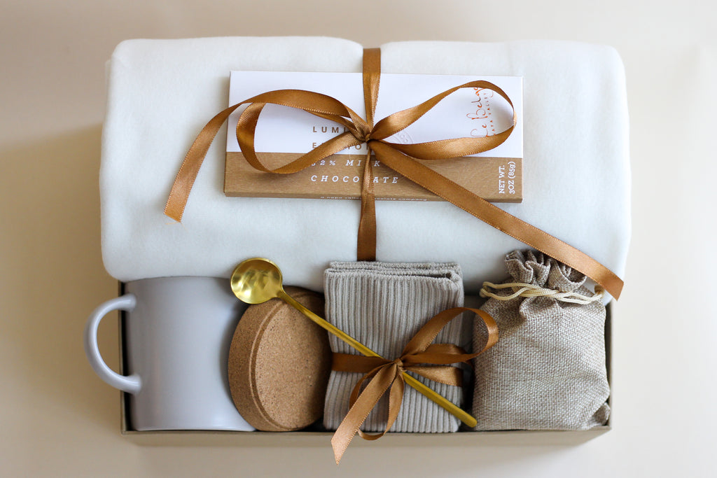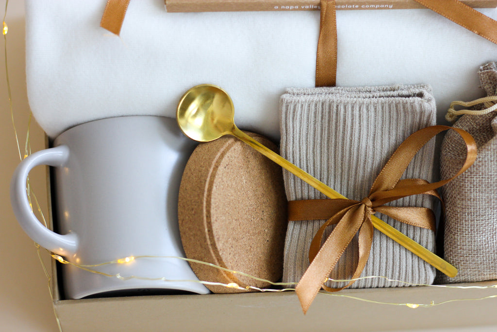 This Cozy Beige gift box is filled with thoughtful items to bring warmth and relaxation. The box includes a blanket, herbal tea, bamboo cotton socks, metal golden spoon, ceramic mug, and a chocolate bar to satisfy sweet cravings. The perfect meaningful gift to show appreciation.