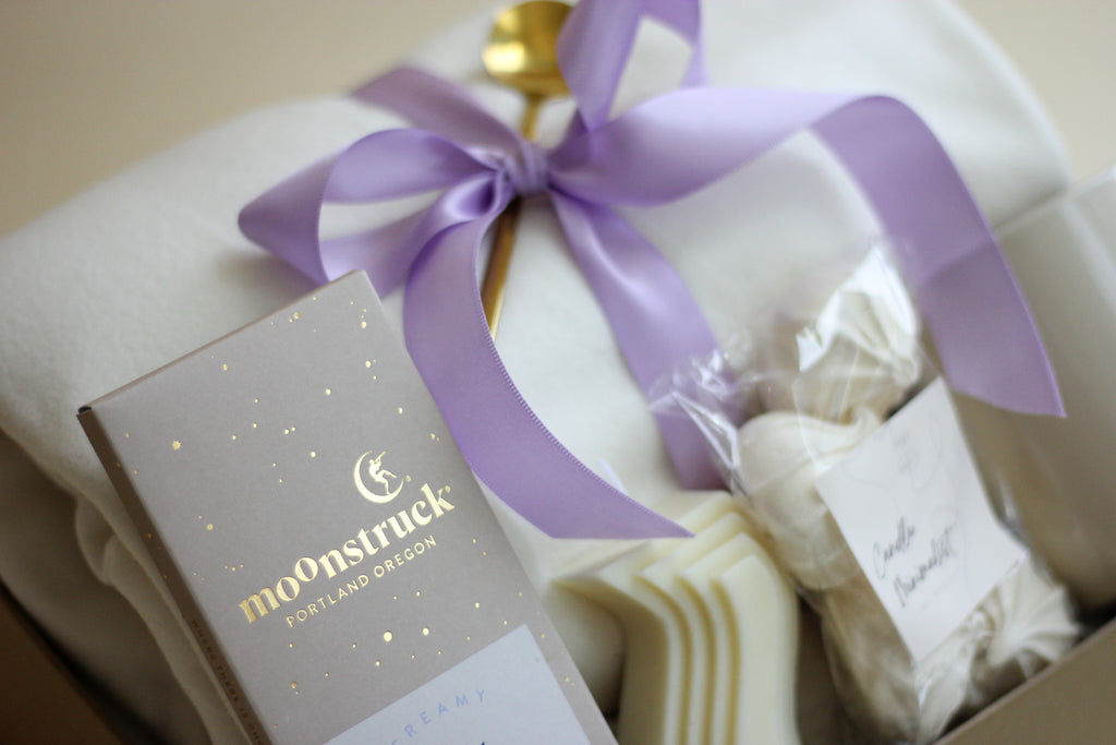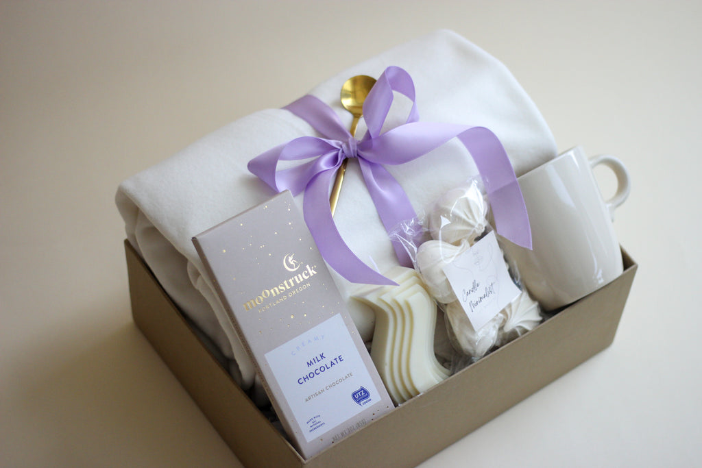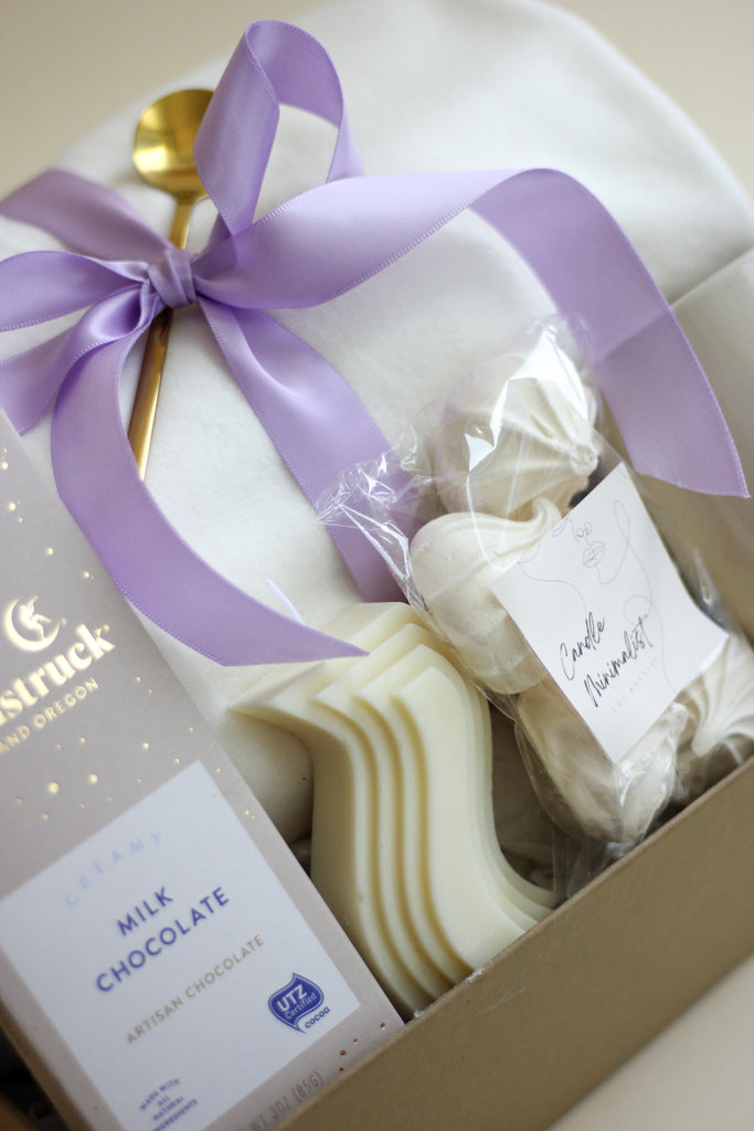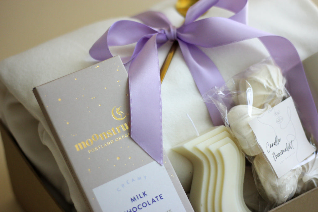 Purple Touch Gift Box, a box of elegance and luxury in a regal purple hue, with a milk chocolate bar, mug and candle to make any occasion special!